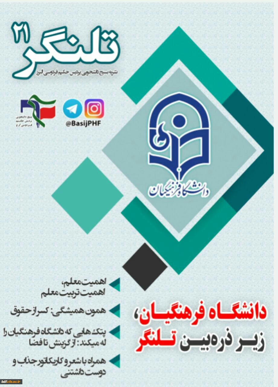 بیست و یکمین شماره از نشریه تلنگر از بسیج دانشجویی دانشگاه فرهنگیان حکیم فردوسی البرز منتشر شد.