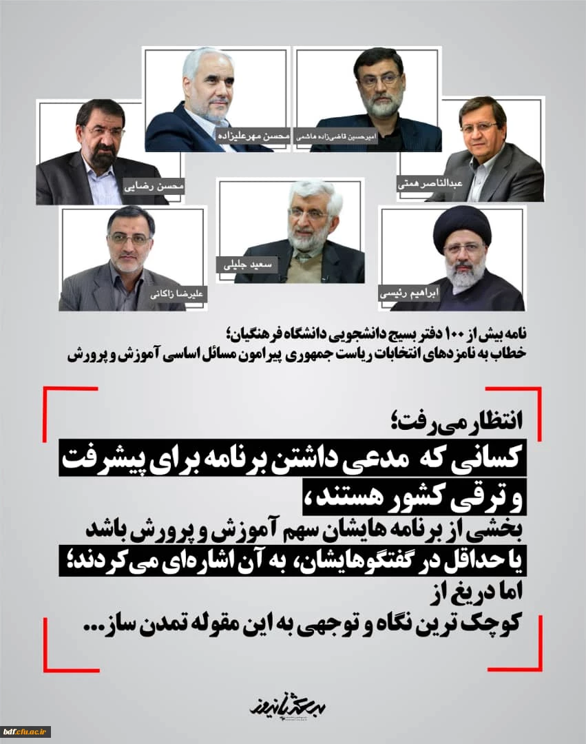 نامه بیش از 100 دفتر بسیج دانشجویی دانشگاه فرهنگیان خطاب به نامزدهای انتخابات ریاست جمهوری پیرامون مسائل اساسی آموزش و پرورش